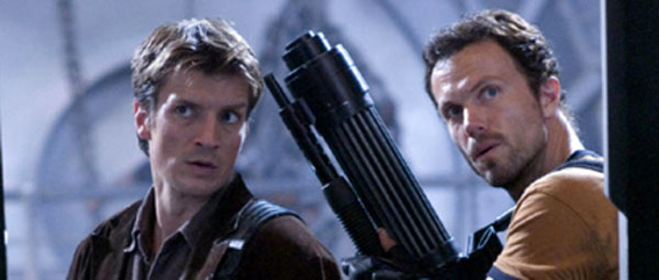 Nathan Fillion, left, and Adam Baldwin in a scene from “Serenity,”